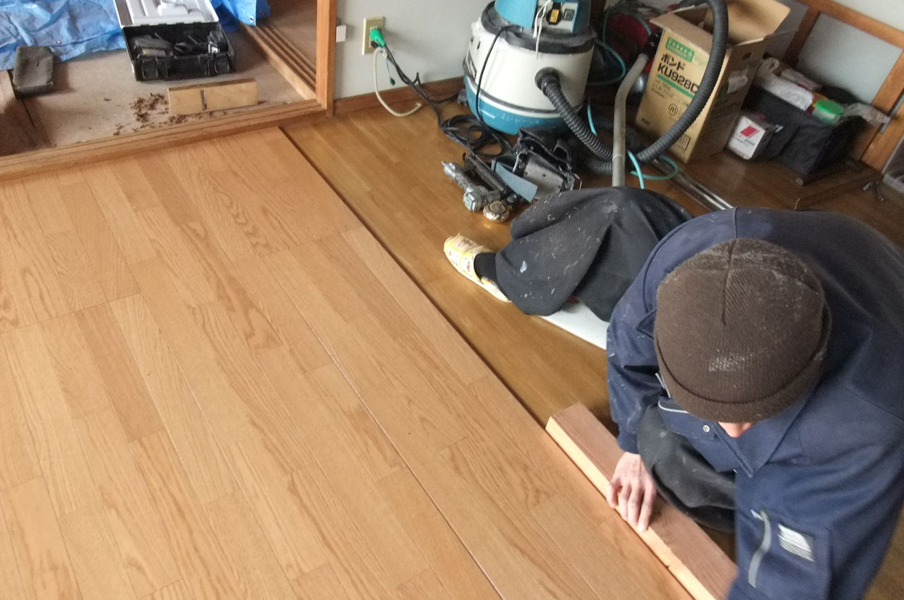 今回は、経年劣化によって、傷んだ床をキレイにするため床の【増し張り】作業もお仕事のひとつに入っております。