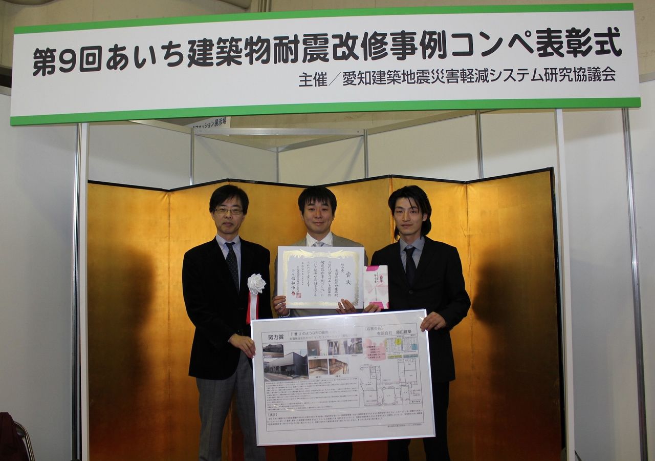 愛知県の官民団体で作らた団体、【愛知建築地震災害軽減システム研究協議会】が主催する木造住宅の耐震改修事例コンペで、小生の勤務する工務店が【努力賞】を受賞しまして、その表彰式がありましたので、ご案内をします。