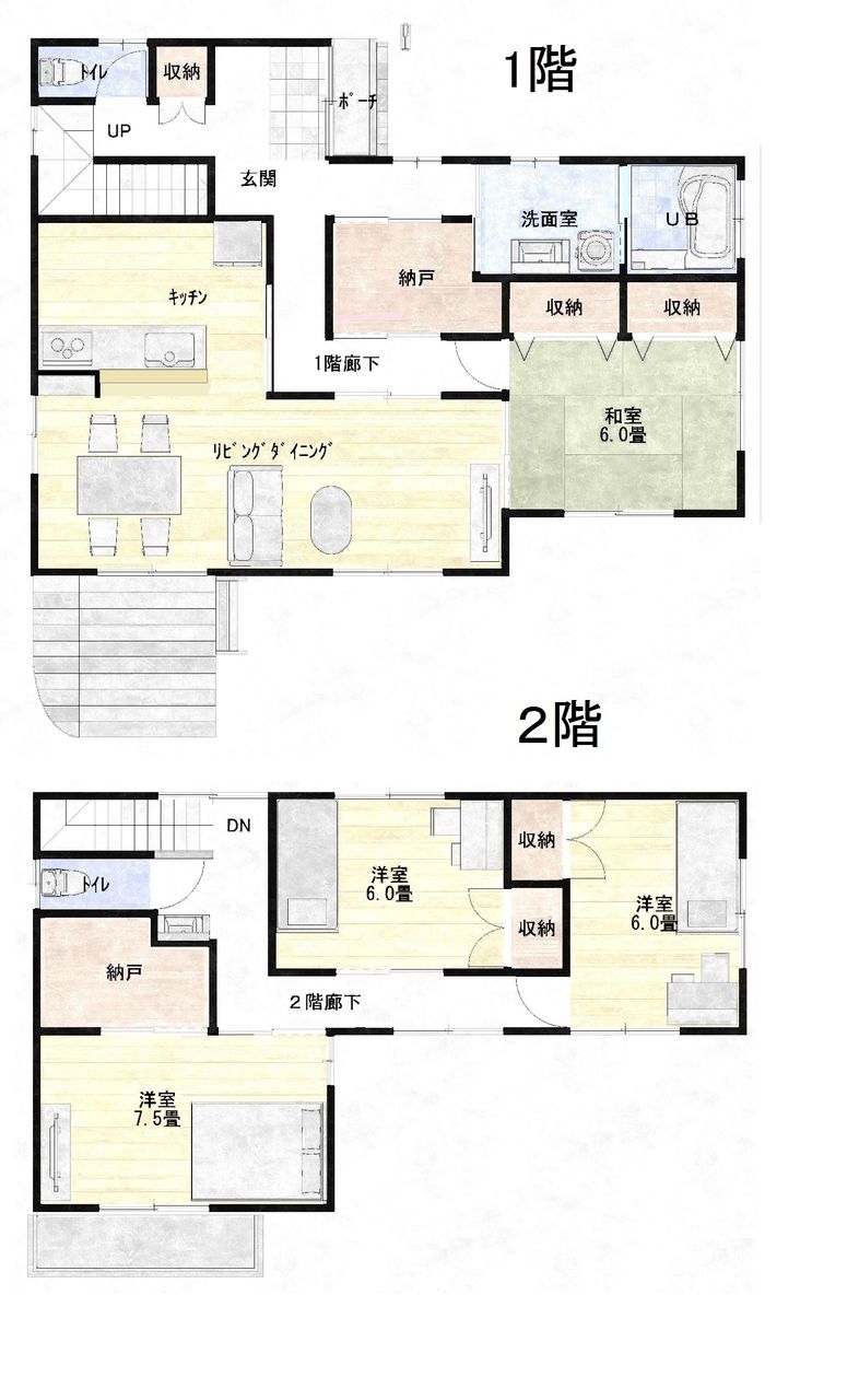 2階:洋室(7.5帖)、洋室(6帖)×2室、納戸(通り抜け可能)