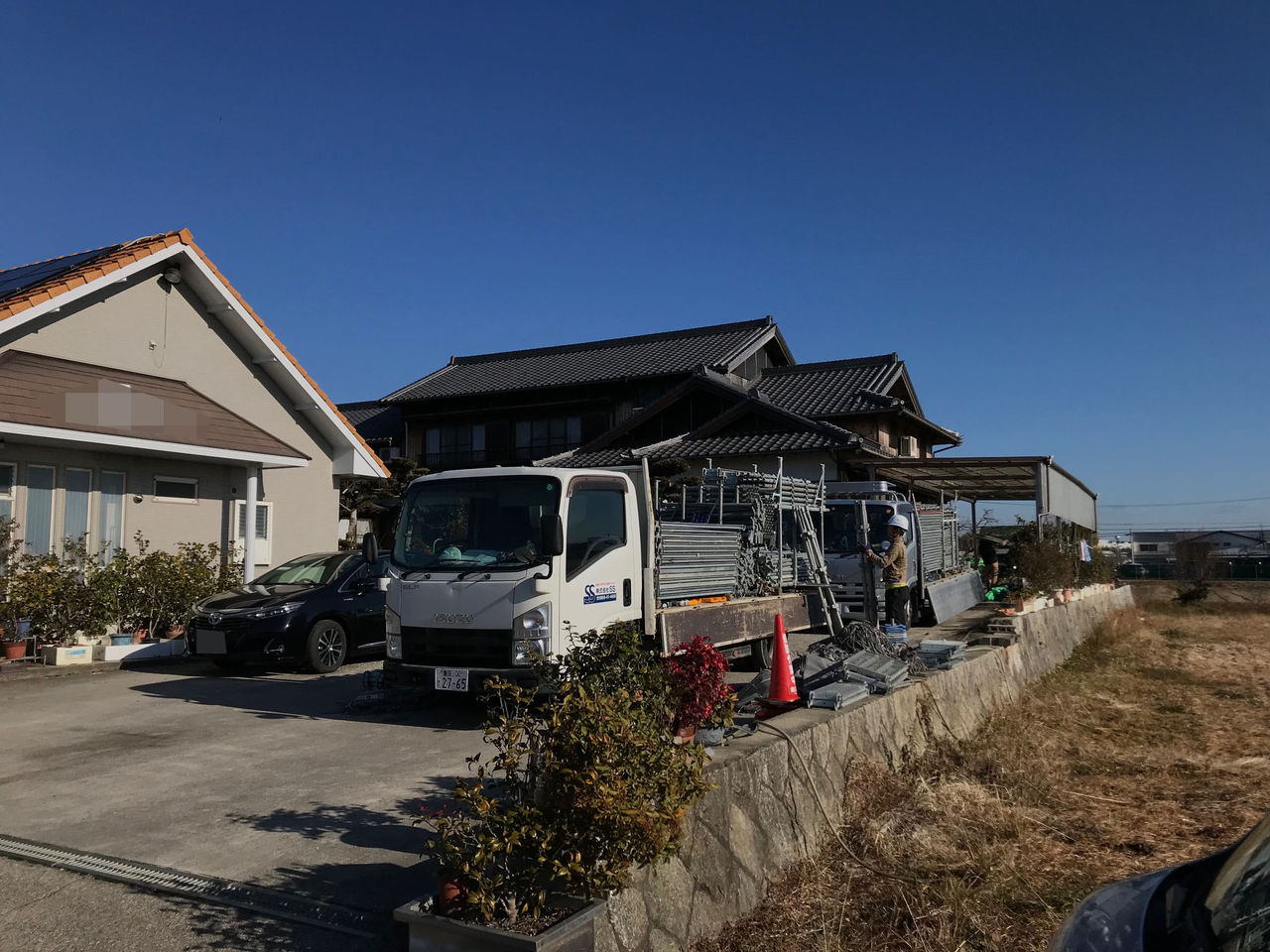 お屋敷が大きいので、足場は2軒分。通常はトラック1台が、今回のお客さまはトラック2台、人員も倍であります。